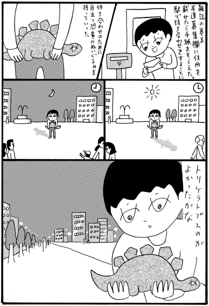 *4 携帯電話などなかった時代の待ち合わせ、「現場で会えない!」なんてたまったものではありません。ので、目立つ格好をして行ったようです。ただ、ライブ会場などの待ち合わせではバンドTシャツは目印になりません。服装もかぶる可能性アリ。そこでこの主人公はぬいぐるみを持っていったようです。でっかいぬいぐるみ、ライブ中は邪魔では?
