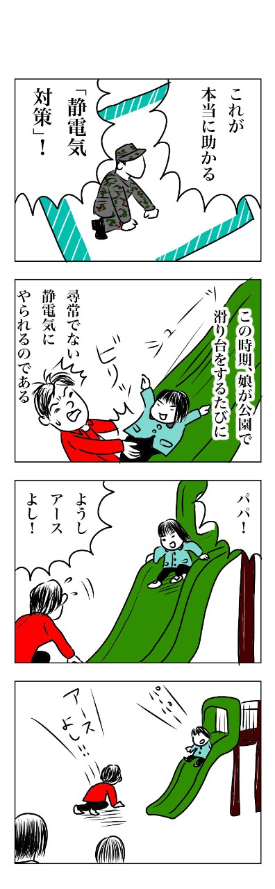 私は冬になるととにかく静電気に悩まされるのですが、何より辛いのが、樹脂製の滑り台から降りてきた娘を受け止める時です。