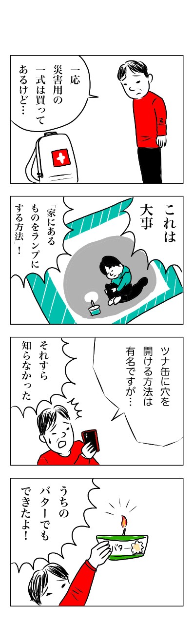 動画では、「ツナ缶を使う即席ランプ」がさぞ知っていて当たり前かのように語られていますが、それすら知らない人が大半だと思います…!!