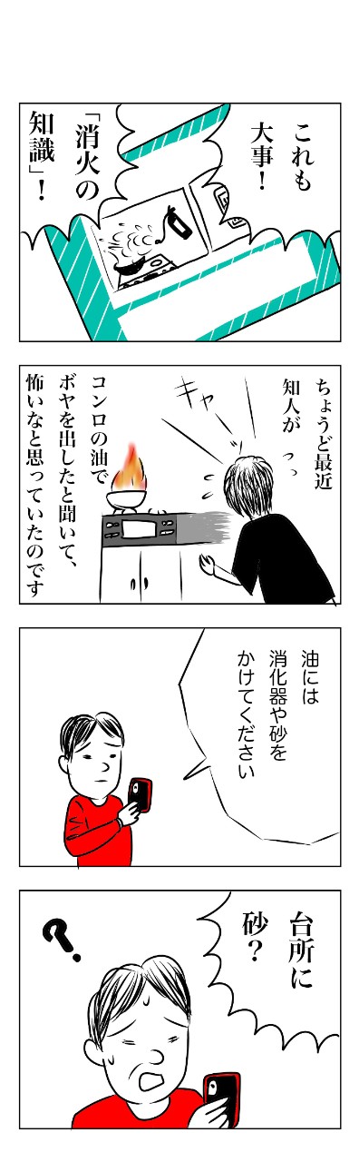 コンロで油が燃えたら、水はかけてはいけないというのはわかっていましたが、コンセントが燃えた時も水はダメなのです。確かに濡れたら漏電するわけですから、考えたらわかりそうなものですが、一刻を争う慌てた状況でその判断が冷静にできるかですよね。