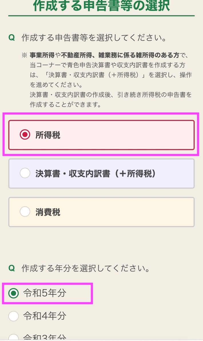 作成する申告書類や提出方法を選択します。