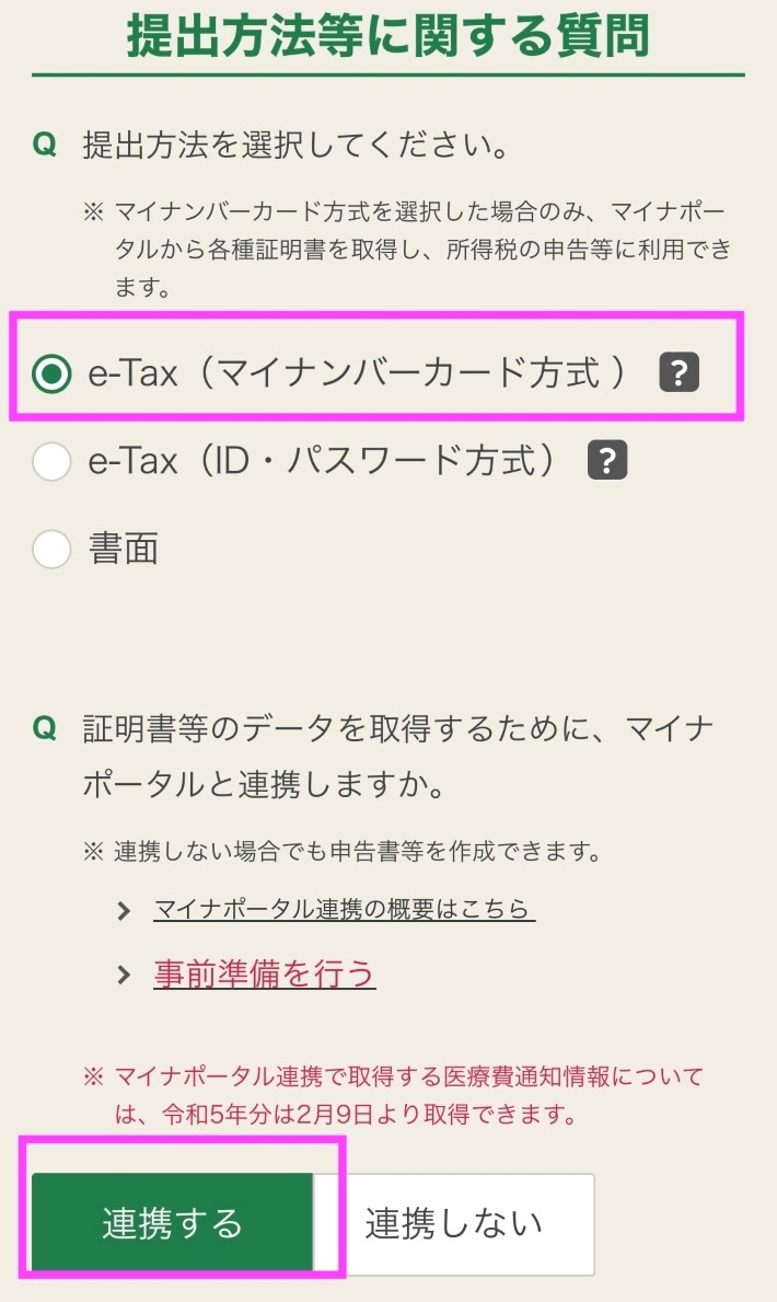 ここではe-Taxマイナンバー方式を選択しマイナポータルと連携します。
