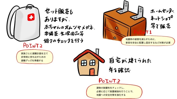 - 地震時の被害を減らすために、家具を安全に配置し固定するなど対策が必要