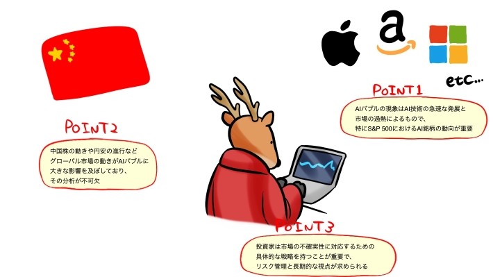- AIバブルの現象はAI技術の急速な発展と市場の過熱によるもので、特にS&P 500におけるAI銘柄の動向が重要