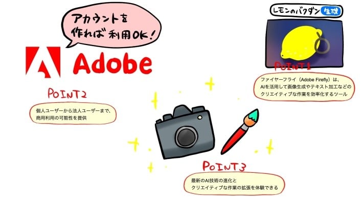 - ファイヤーフライ(Adobe Firefly)は、AIを活用して画像生成やテキスト加工などのクリエイティブな作業を効率化するツール
