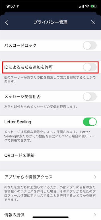 設定画面から「プライバシー管理」を選択し「IDによる友だち追加を拒否」をオンにします。