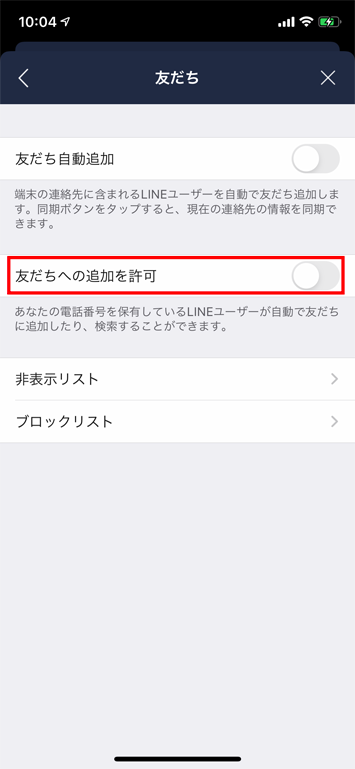 設定画面から「友だち」を選択し「友だちへの追加を許可」をオフにします。