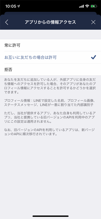 設定画面から「プライバシー管理」>「アプリからの情報アクセス」をタップし「常に許可」「お互いに友達の場合は許可」「拒否」から任意の設定を選択します。