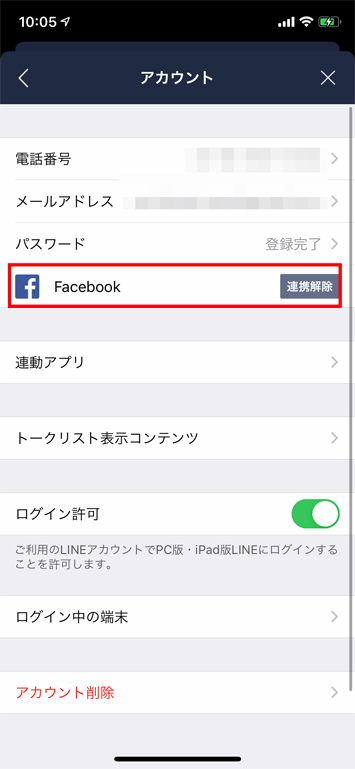設定画面から「アカウント」を選択し「Facebook」の連携を解除します。
