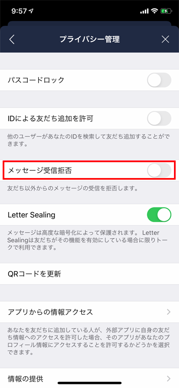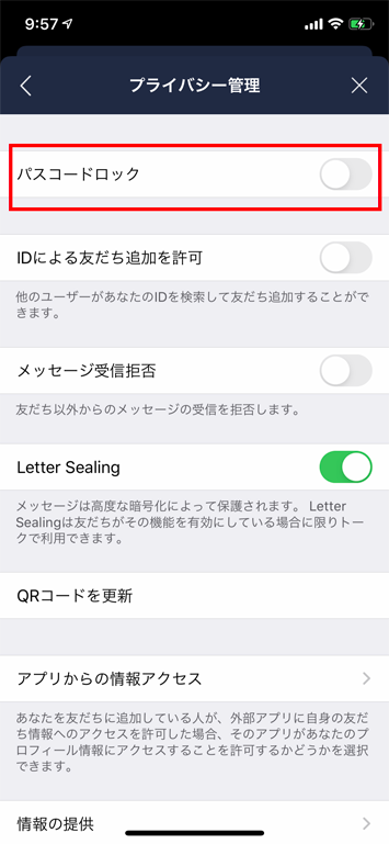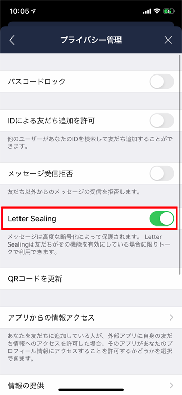 設定画面から「プライバシー管理」を選択し「Letter Sealing」をオンにします。