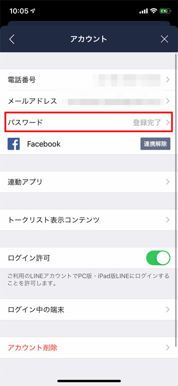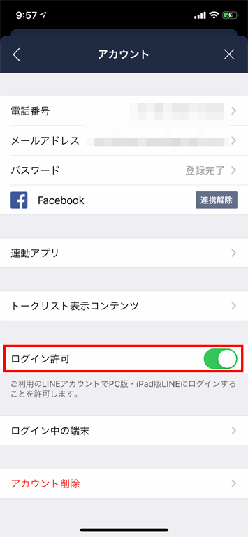 設定画面から「アカウント」を選択し「ログイン許可」をオフにします。