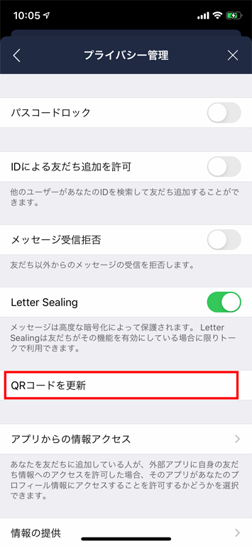 設定画面から「プライバシー管理」を選択し「QRコードを更新」をタップし、画面の指示に従います。