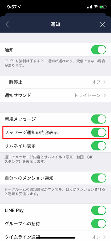 設定画面から「通知」を選択し「メッセージ通知の内容表示」をオフにします。