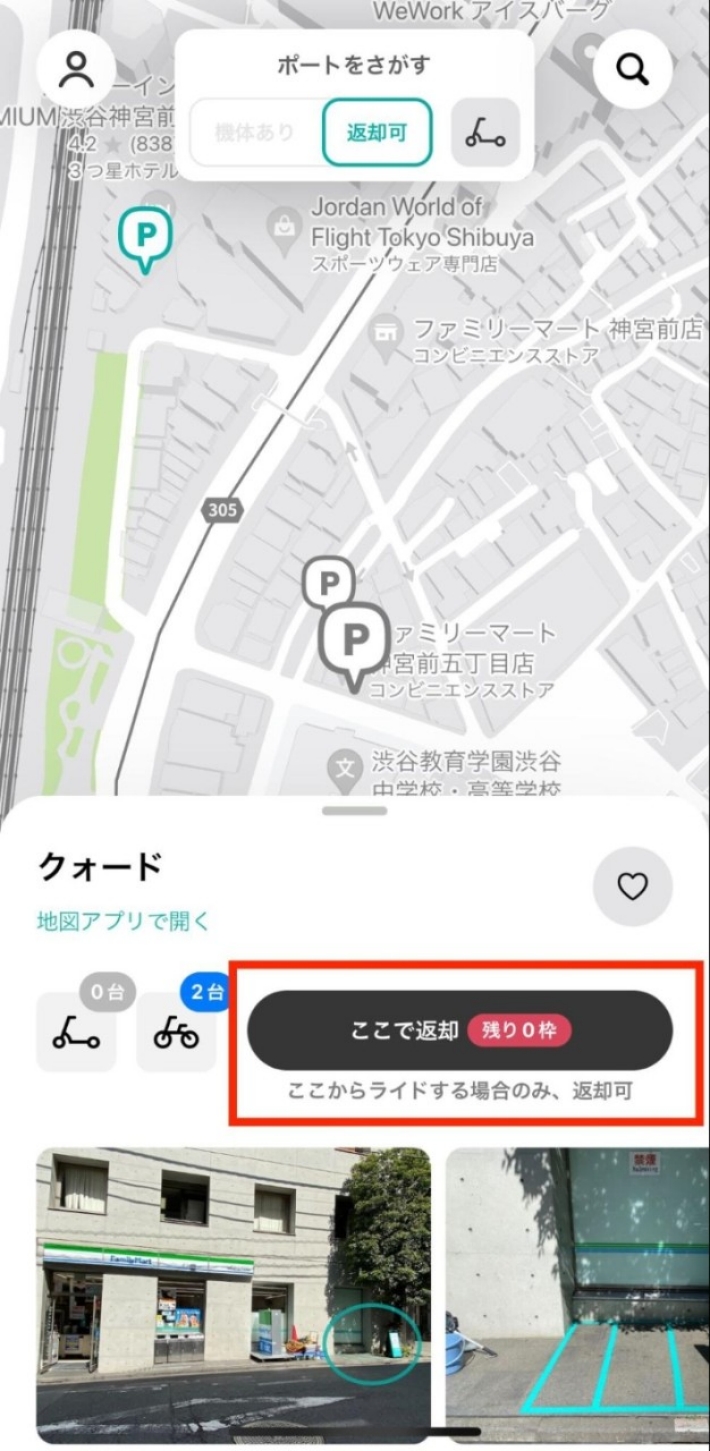 返却ポートに到着したら、スマートフォンのアプリを表示させ「ライド終了」のボタンをタップし、返却したことを証明するため機体を撮影して終了です。