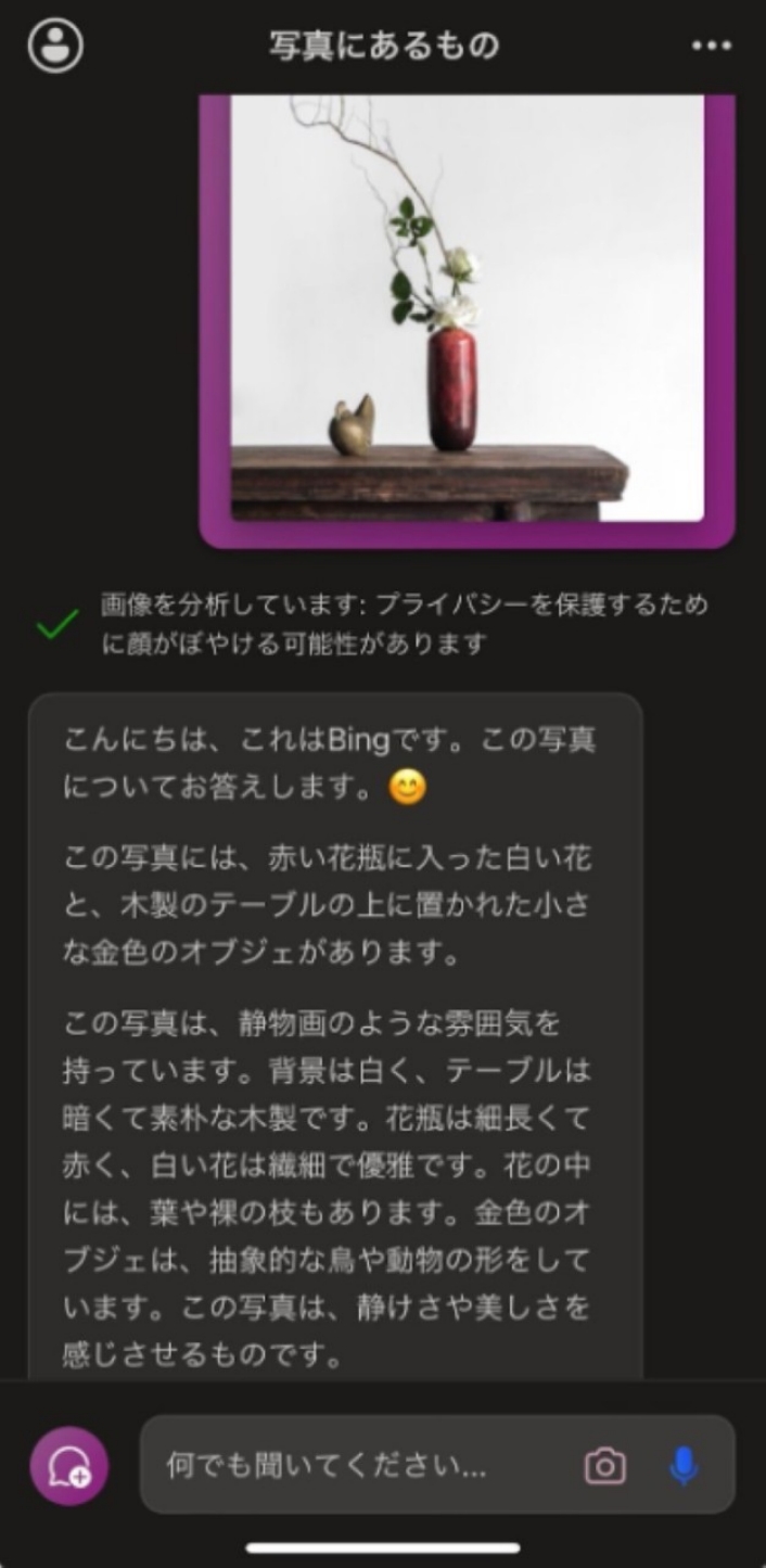 例えば、画像のようにテーブルの素材、花瓶の形や色、置物が鳥であることまで詳細に伝えてくれます。