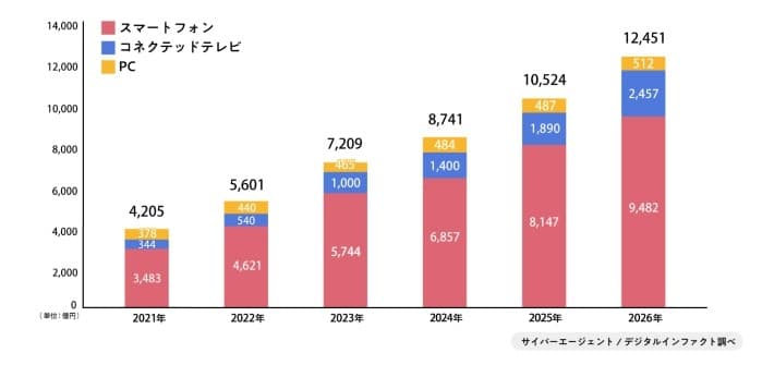 また、今後も動画広告市場は高い成長率で市場を拡大していくと予想されており、2024年に8,741億円、2026年には1兆2,451億円に達するという予測まであります。